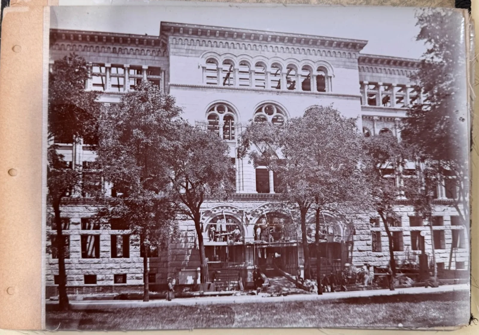 One album I found was an unbound collection of photographs during the time of the Newberry Library’s construction. The library was built by Henry Ives Cobb, himself a librarian as well as an architect, in the 1890s. The construction was funded by Walter L. Newberry’s estate and overseen by its trustees.