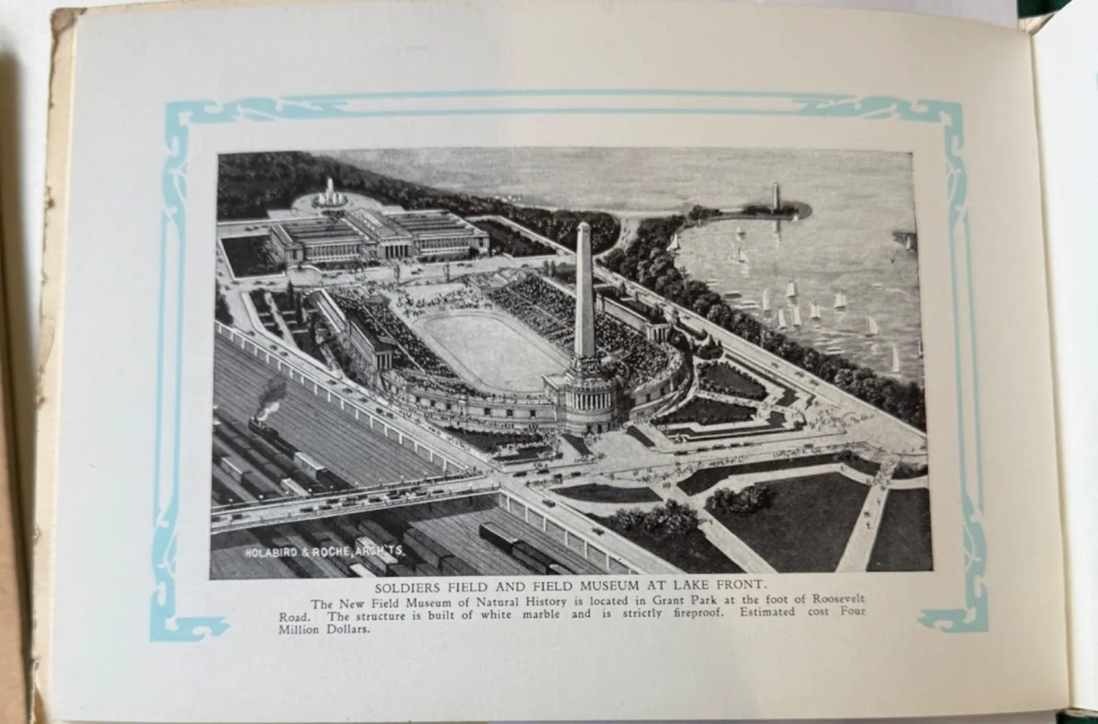 One book I ordered, Horder’s Pictorial Chicago: Souvenir Book of Views (1930), compiled birds-eye views of the city and shots of its major attractions, specifically the new construction of the iconic Chicago tour stops, Soldiers Field, the Field Museum, and the lake front.